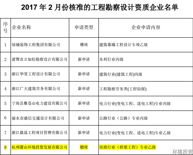 3月14日,投资公司资质申报事情迎来2017年开门红。凭证省住建厅宣布的2017年2月份工程勘探设计资质企业名单,投资公司申报的市政行业(桥梁工程)专业乙级设计资质正式通过审考批准。