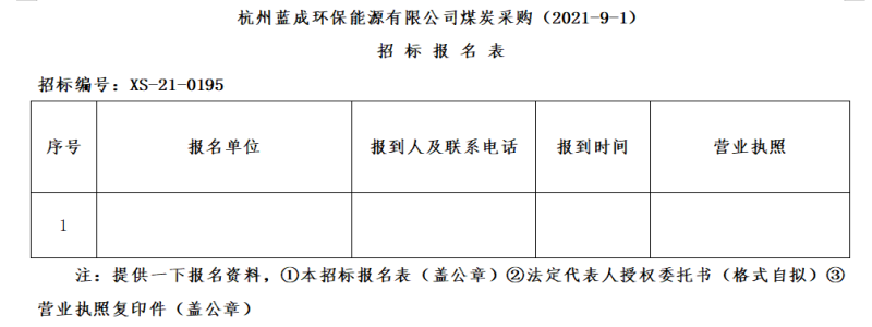 ¶þ¡¢ÕбêÏîÄ¿£ºº¼ÖÝÀ¶³É»·±£ÄÜÔ´ÓÐÏÞ¹«Ë¾ÃºÌ¿²É¹º(2021-9-1)¡£