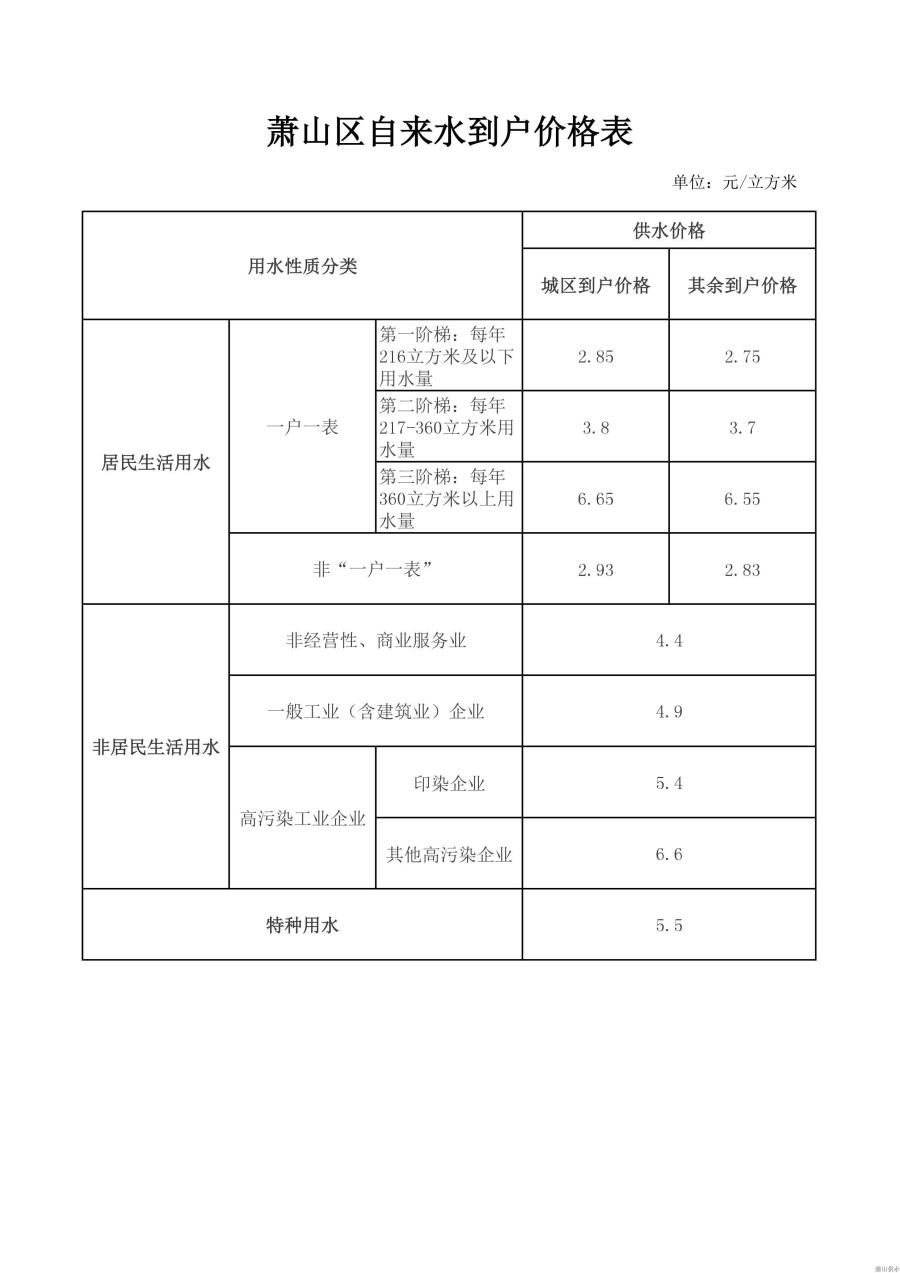 非住民生涯用水:供水价钱凭证萧价【2016】46号文件自2017年1月1日用水时间起执行;污水处置惩罚价凭证萧价【2014】46号文件自2014年8月1日排水时间起执行 。