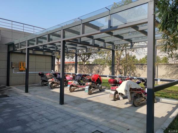 近期,经公司批准,南片水厂食堂北面制作起了一套电瓶车集中充电设施,彻底消除了电瓶车充电带来的清静隐患。选用的智能充电系统,具有充电完成自动断电;每次充电满4个小时,自动断电的功效,且每辆电瓶车均为单路充电,确保充电清静,避免火灾的爆发;在思量车棚质料选择上,接纳不燃质料钢化玻璃及铝合金方管举行搭建,清静获得进一步包管。