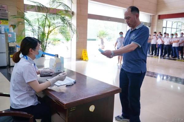 用户佩带口罩有序进入,举行体温丈量、出示康健码、挂号身份信息。