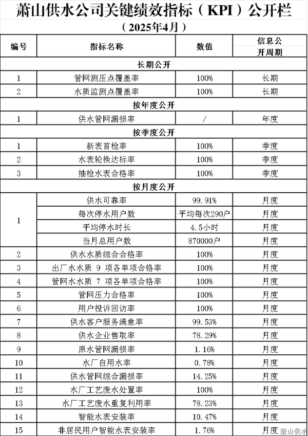 AG真人国际官方网站供水公司要害绩效指标(KPI)果真栏(2025年4月)