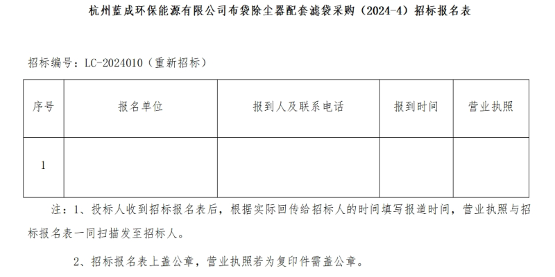 杭州蓝成环保能源有限公司布袋除尘器配套滤袋采购(2024-4)招标通告