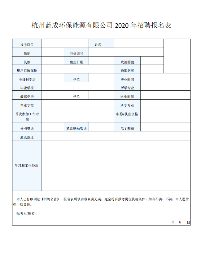 2、报名方法:请填写康健允许书并按报名表要求认真填写相关信息,并将小我私家简历、身份证、结业证书、学位证书等扫描件打包发送至邮箱:hzlanchenghuanbao@163.com;